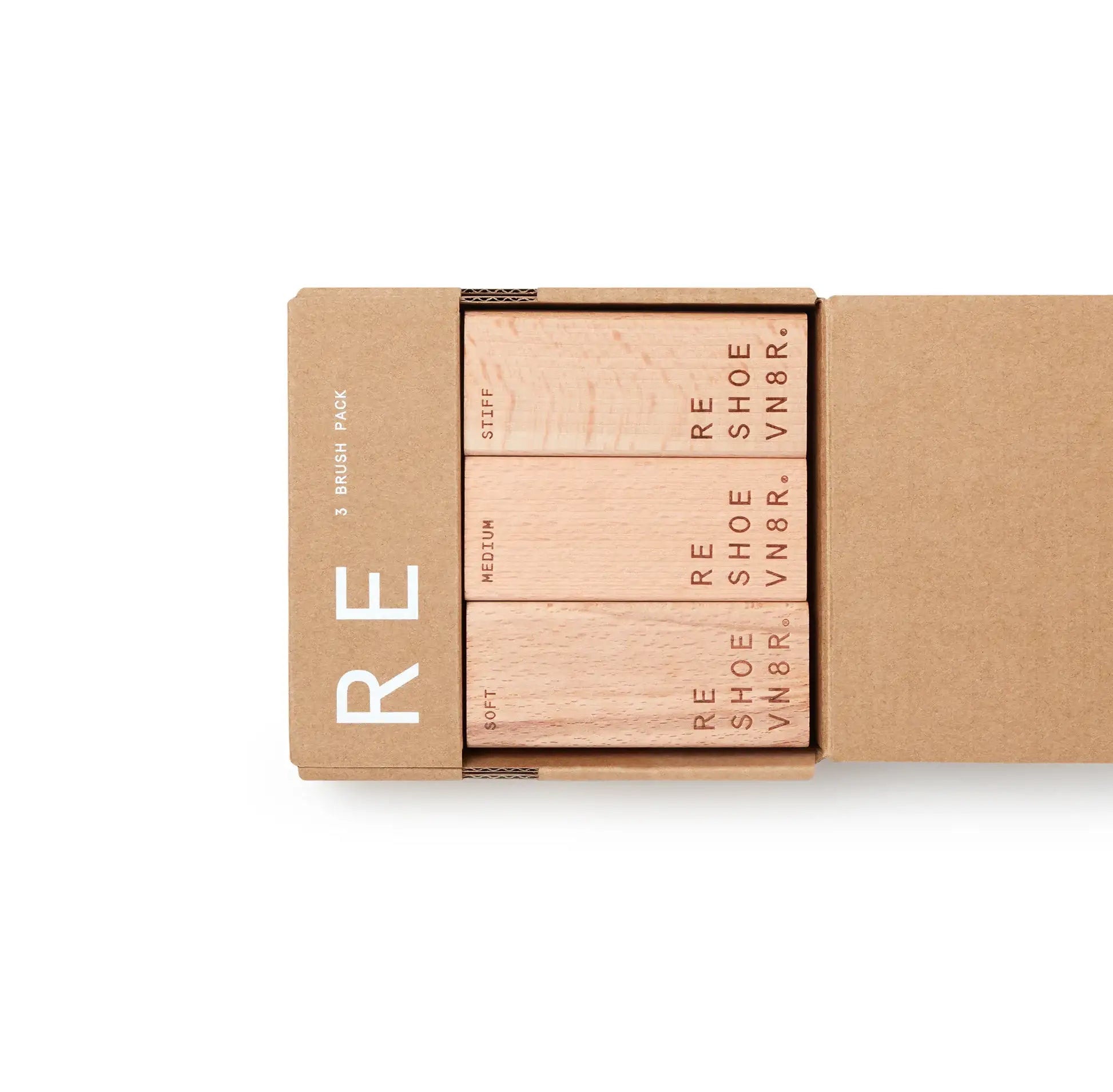 The RESHOEVN8R Shoe Care 3 Brush Pack includes three different brushes with varying levels of firmness: soft, medium, and stiff, to provide the most effective top-to-bottom clean.